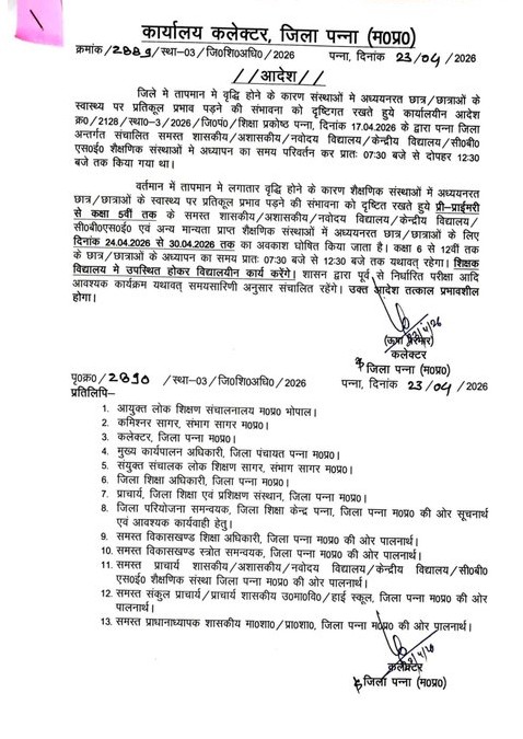 पन्ना कलेक्टर ऊषा परमार और सिंगरौली कलेक्टर गौरव बैनल ने कक्षा 5वीं तक के बच्चों के लिए 24 अप्रैल से महीने के अंत तक अवकाश घोषित किया है। बड़ी कक्षाओं (6वीं से 12वीं) के लिए समय सुबह साढ़े सात बजे से साढ़े बारह बजे तक सीमित कर दिया गया है।